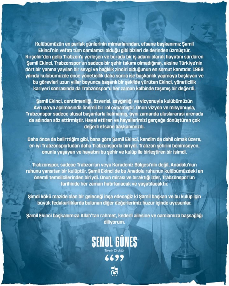 Trabzonspor Teknik Direktörü Şenol Güneş, dün akşam yaşamını yitiren eski başkanlardan Şamil Ekinci için bir taziye mesajı yayımladı. Güneş Ekinci'nin, centilmenliği, özverisi, saygınlığı ve vizyonuyla bordo-mavili kulübün Avrupa'ya açılmasında önemli bir rol oynadığını belirterek, "Onun vizyon ve misyonuyla, Trabzonspor sadece ulusal başarılarla kalmamış, aynı zamanda uluslararası arenada da adından söz ettirmiştir. Hayal ettiren ve hayallerimizi gerçeğe dönüştüren çok değerli efsane başkanımızdı" dedi.