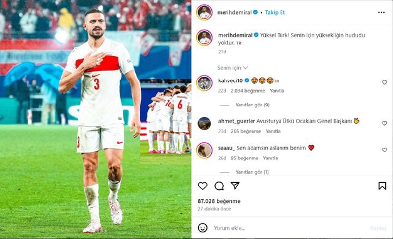 Avusturya karşısında attığı iki golle A Milli Takım'ın çeyrek finale yükselmesinde önemli rol oynayan Merih Demiral, sosyal medya hesabından paylaşım yaptı.