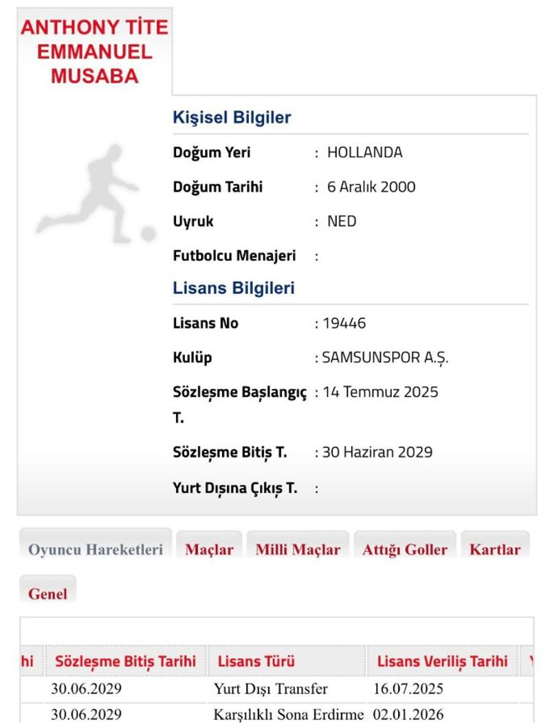 Süper Lig devi Fenerbahçe'ye imza atmaya hazırlanan Anthony Musaba'nın, Samsunspor ile olan sözleşmesi feshedildi.Karadeniz ekibi, Anthony Musaba'nın sözleşmesinin karşılıklı olarak feshedildiğini TFF'ye bildirdi.