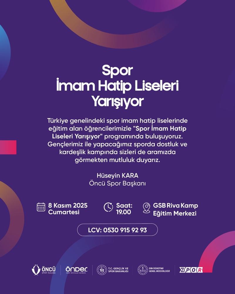 Öncü Spor Kulübü'nün gençleri ünlü spor adamlarıyla buluşturarak onlara bir vizyon çizmeyi hedeflediği "Spor İmam Hatip Liseleri Yarışıyor" programı, 7-9 Kasım 2025 tarihlerinde GSB Riva Kamp Eğitim Merkezi'nde yapılacak. Türkiye'nin dört bir yanındaki 35 spor imam hatip lisesinden katılacak gençler En Hızlı (40m), En Güçlü (Mekik Koşusu), En Çevik (Catchpad) ve Parkur Yarışmalarında karşılaşacak. Kazananlara ise çeşitli ödüller verilecek.