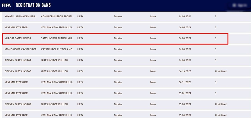 Yeni güncelleme ile birlikte daha önceden yasaklı kulüpler arasında ismi yer almayan Samsunspor'a üzücü haber geldi. 24 Haziran tarihi ile yayımlanan raporda Samsunspor'un 2 dönem transfer yasağının bugün itibari ile yürürlüğe geçtiği bildirildi. Kamuoyuna açıklanan raporda Samsunspor'un yanı sıra Süper Lig kulüplerinden Kayserispor'un, TFF 2. Lig ekiplerinden Yeni Malatyaspor ile Giresunspor'un da 2 dönem transfer yasağının başlangıç tarihi olarak 24 Haziran olduğu ifade edildi.