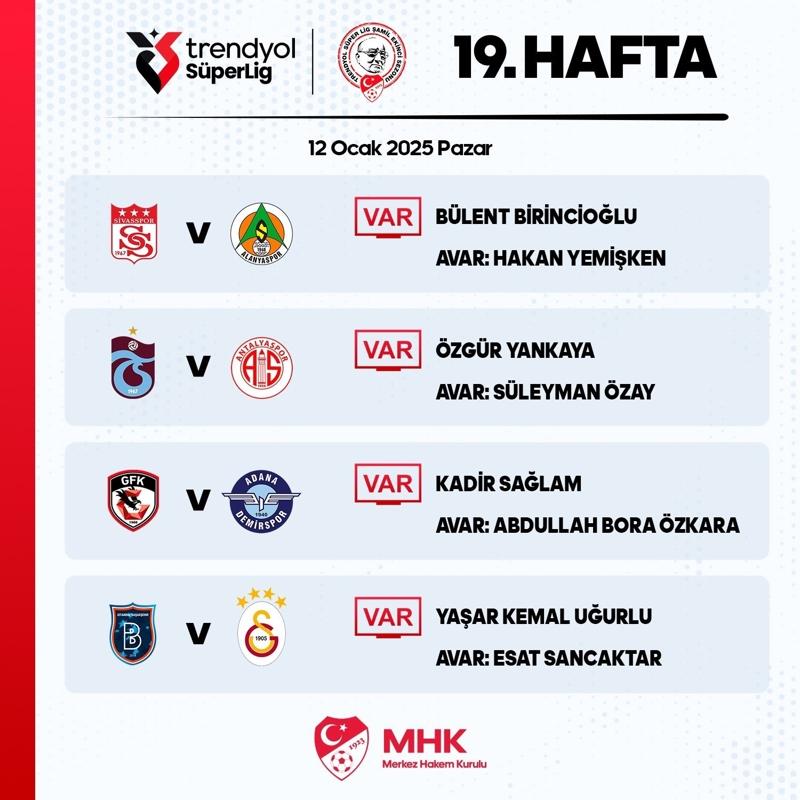 Buna göre bugün saat 16.00'da oynanacak Trabzonspor-Antalyaspor maçında VAR hakemi Özgür Yankaya olurken, 19.00'daki Başakşehir-Galatasaray müsabakasında Yaşar Kemal Uğurlu görev yapacak.