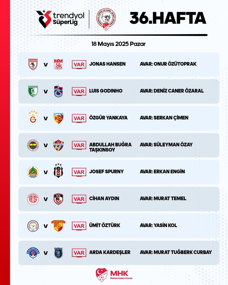 Trendyol Süper Lig'de 36'ıncı hafta oynanıyor. Türkiye Futbol Federasyonu (TFF), bu akşam oynanacak maçların VAR hakemlerini duyurdu.