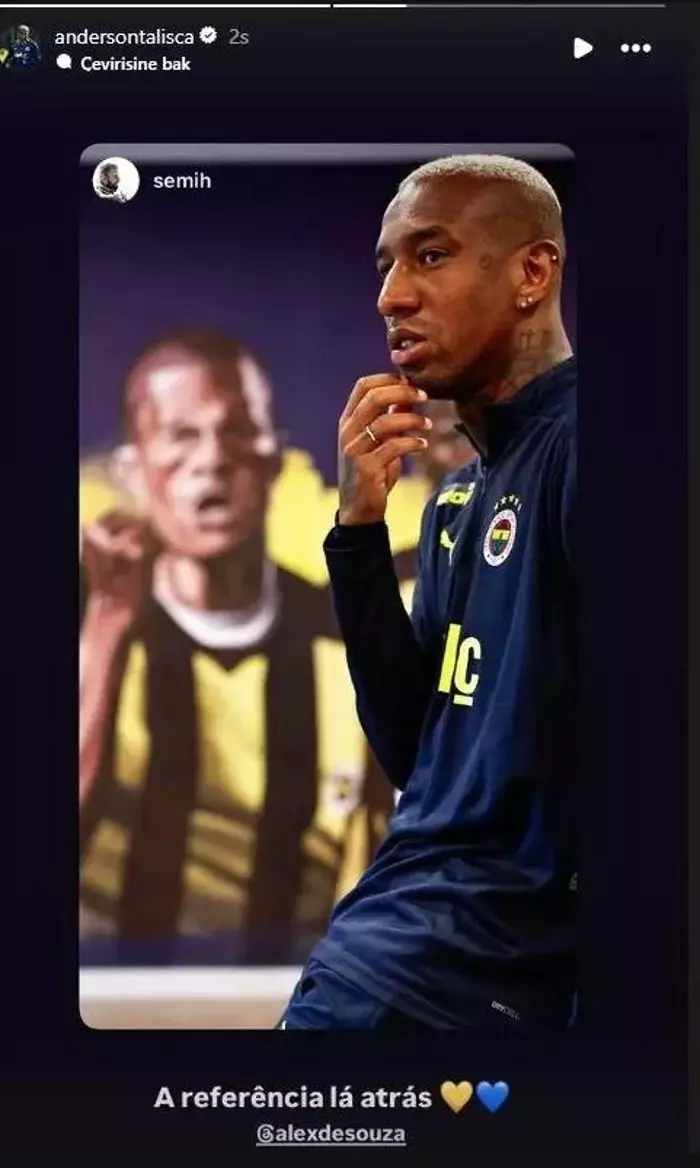 Fenerbahçe'nin Brezilyalı yıldızı Anderson Talisca, sosyal medya hesabından bir paylaşımda bulundu. Talisca paylaşımında, "Referans: Alex de Souza" yazdı. Bu paylaşım Fenerbahçe taraftarlarının büyük beğenisine neden oldu.