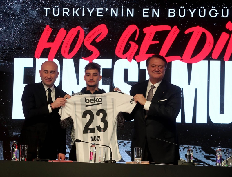 23 yaşındaki Arnavut oyuncunun boynunda kartal dövmesi olduğunu hatırlatan ve transferin çok zorlu koşulların ardından gerçekleştiğini ifade eden Arat, "2001 doğumlu. Aynı zamanda boynunda Kartal var. Sanırım bu bir kader. Çok uğraştık. Arnavutluk milli takım oyuncusu. Bu sene Avrupa Şampiyonası'na katılacak. İlk profesyonel maçını Tiran'da 16 yaşında oynadı. 2021 yılında Varşova'ya geldi. Babası da şu an aramızda. Muçi, sen Beşiktaşlıların çok sevdiği ve güvendiği bir futbolcu olacaksın. Santos hocam ve Samet hocam seni çok istiyordu. Samet hocam 2 aydır senle ilgili çalışmalar yapıyordu. Evine, Beşiktaş'a hoş geldin. Boynundaki kartal dövmesi hayattır, kaderin cilvesidir. Bütün Beşiktaşlılarla kucaklaş" şeklinde konuştu.