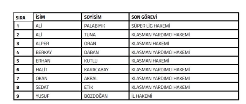 TFF'den yapılan açıklamaya göre, eski Süper Lig hakemi Ali Palabıyık'ın da aralarında olduğu 2 eski klasman hakemi, 5 eski klasman yardımcı hakemi ve 1 eski il hakemi, futbol disiplin talimatının 57. maddesi uyarınca tedbirli olarak disiplin kuruluna sevk edildi.