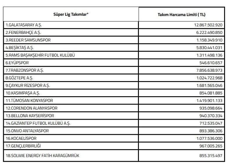 Süper Lig'de ara transfer dönemi için en fazla harcama limiti Galatasaray'a verilirken, en düşük limit Eyüpspor'a verildi. Federasyondan konuyla ilgili yapılan açıklamada şöyle denildi: