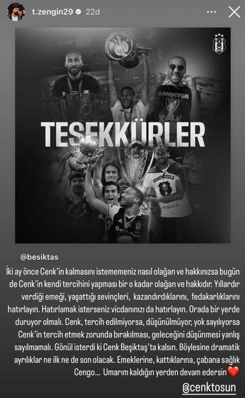 Siyah-beyazlı takımın eski kalecisi paylaşımında "İki ay önce Cenk'in kalmasını istememeniz nasıl olağan ve hakkınızsa bugün de Cenk'in kendi tercihini yapması bir o kadar olağan ve hakkıdır. Yıllardır verdiği emeği, yaşattığı sevinçleri, kazandırdıklarını, fedakarlıklarını hatırlayın. Hatırlamak isterseniz vicdanınızı da hatırlayın. Orada bir yerde duruyor olmalı. Cenk, tercih edilmiyorsa, düşünülmüyor, yok sayılıyorsa Cenk'in tercih etmek zorunda bırakılması, geleceğini düşünmesi yanlış sayılmamalı. Gönül isterdi ki Cenk Beşiktaş'ta kalsın. Böylesine dramatik ayrılıklar ne ilk ne de son olacak. Emeklerine, kattıklarına, çabana sağlık Cengo... Umarım kaldığın yerden devam edersin" ifadelerini kullandı.