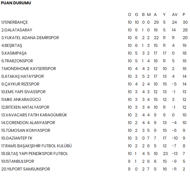 LİGİN 10. HAFTASINDA YAPILAN MAÇLAR VE ALINAN SONUÇLAR ŞÖYLE: