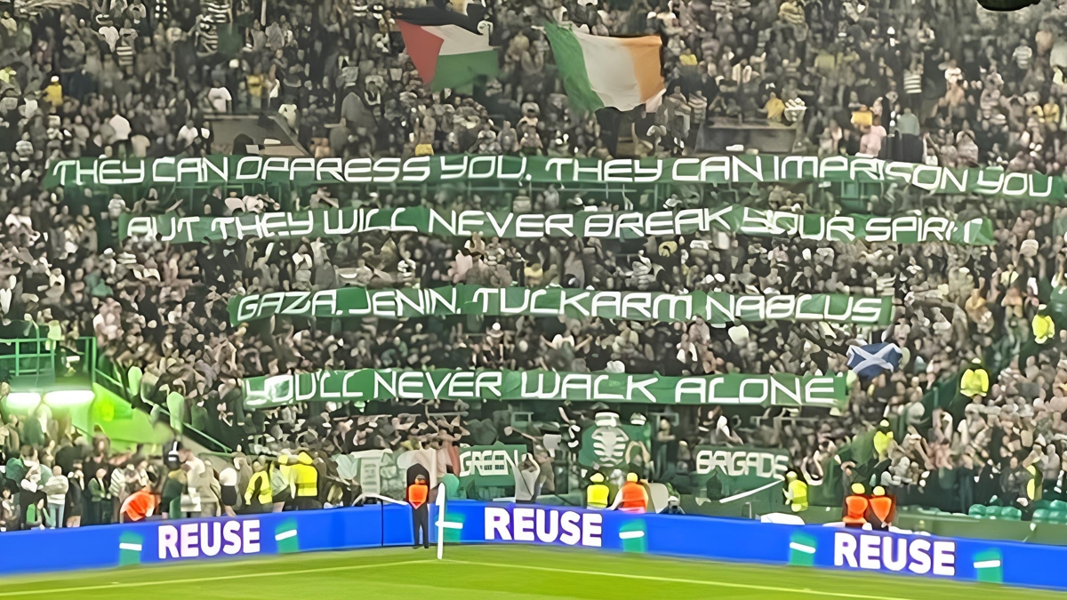 İç sahada oynanan birçok karşılaşmada İsrail işgali altındaki Filistin'e destek veren yeşil-beyazlı takımın taraftarları, Celtic Park ev sahipliğindeki Slovan Bratislava mücadelesinde de açtıkları pankart ve bayraklarla desteğini sürdürdü.