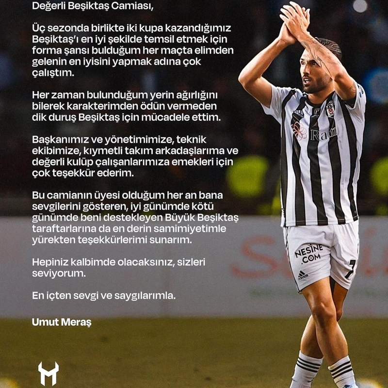 Beşiktaş ile sözleşmesinin sona ermesinin ardından Umut Meraş, sosyal medya hesabından bir veda metni yayımladı. 28 yaşındaki oyuncu, veda metninde şu ifadeleri kullandı: