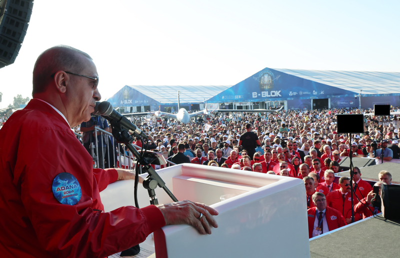 "Savunma sanayi alanında dışa bağımlılığımızı en aza indirmeye çalışıyor, yerli ve milli üretimi çok güçlü biçimde destekliyoruz. Devlet destekli siber saldırılara ve dijital terör eylemlerine karşı mukavemetimizi sürekli güçlendiriyoruz. Elektronik harp ve milli yazılım konusu zaten gündemimizin üst sırasında yer alıyor. Teknolojiyi sadece kullanan değil tasarlayan, geliştiren, üreten ve ihraç eden ülke hedefimiz doğrultusunda emin adımlarla ilerliyoruz. Tanktan zırhlı araçlara, savaş gemisinden denizaltına, uçaktan helikoptere, silahlı ve silahsız insansız hava araçlarından hava savunma sistemlerine kadar çok geniş bir alanda hamdolsun son derece güçlüyüz. İnşallah çok daha iyi yerlerde olacağız. TB2'lerle yakaladığımız, Akıncı ile sürdürdüğümüz ivmeyi savaş uçağımız Kızıl Elma ile çok farklı bir seviyeye taşıyacağız. Şu hakikati lütfen aklınızdan çıkarmayın, Adanalı kardeşlerim 'Elle gelen öğün olmaz o da arasan bulunmaz.' atasözünü çok iyi bilir. Biz de savunma sanayi alanı başta olmak üzere dışa bağımlılığın acısını çok iyi bilen bir ülkeyiz. Bize takılan çelmeleri, müttefiklerimizin uyguladığı gizli-açık ambargoları unutmadık."
