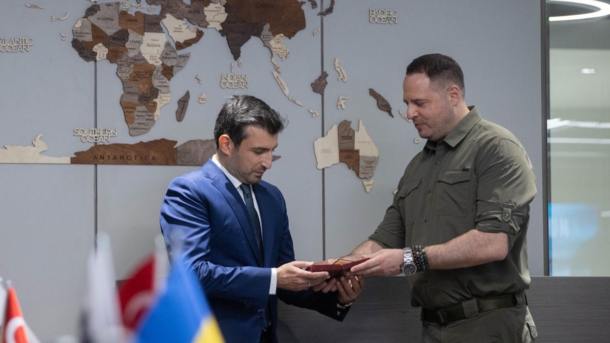 Baykar'dan yapılan açıklamaya göre, Andriy Yermak ziyarette Baykar Teknoloji Lideri Selçuk Bayraktar'a Ukrayna Devlet Başkanı Volodimir Zelenskiy tarafından verilen Devlet Liyakat Nişanı'nı takdim etti.