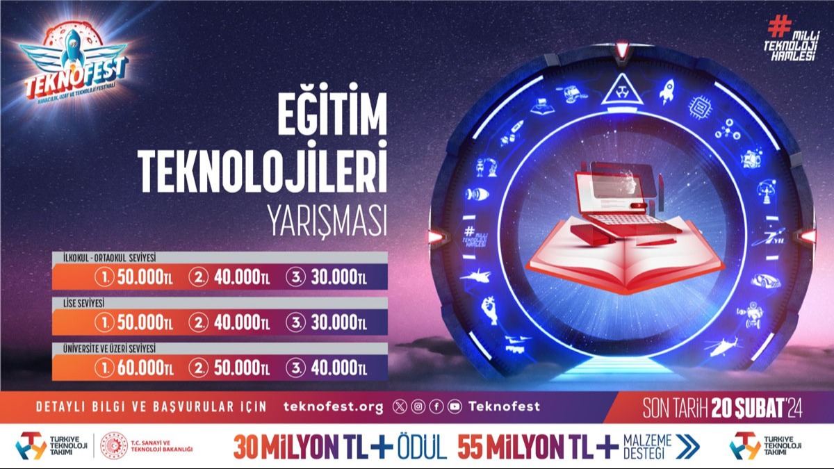TEKNOFEST kapsamında düzenlenen Eğitim Teknolojileri Yarışmasında; ilkokul ve ortaokul seviyesindeki birincilere 50.000 TL, ikincilere 40.000 TL, üçüncülere 30.000 TL, lise seviyesinin birincisine 50.000 TL, ikincisine 40.000 TL, üçüncüsüne 30.000 TL, üniversite ve üzeri seviyesindeki birinciye ise 60.000 TL, ikinciye 50.000 TL, üçüncüye 40.000 TL ödül verilecek. Başvuruların 20 Şubat tarihinde sona ereceği yarışma için sende hemen hazırlan!
