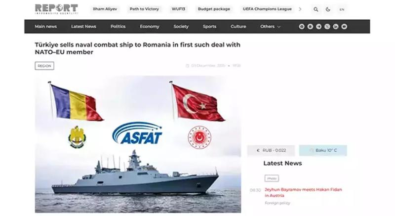Türkiye'nin NATO ve Avrupa Birliği üyesi bir ülkeye ilk kez savaş gemisi satması, uluslararası basında geniş yankı uyandırdı. Milli Savunma Bakanlığı'na bağlı ASFAT, İstanbul Tersanesi Komutanlığı'nda 2024'te inşa edilen TCG Akhisar korvetinin Romanya Deniz Kuvvetleri'ne teslim edildiğini açıkladı. Bu satışla Türkiye, savunma sanayisinde yeni bir döneme girdi.