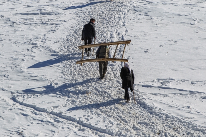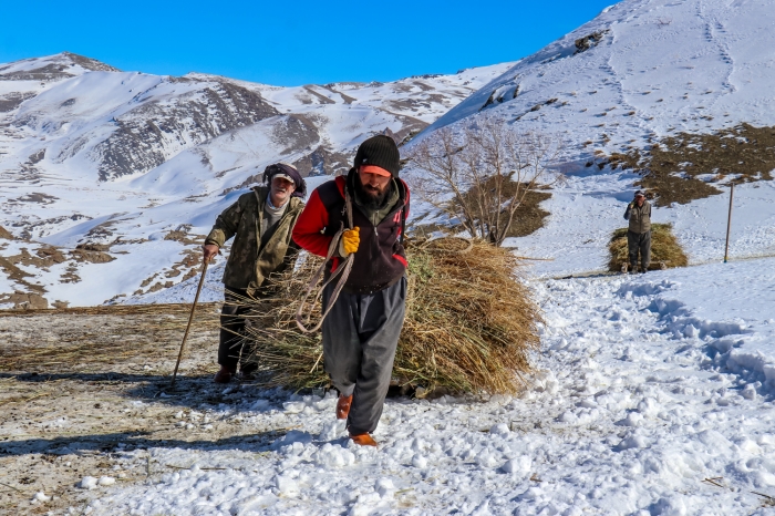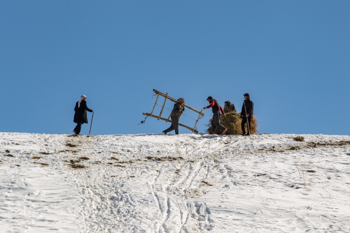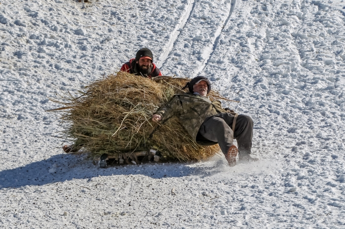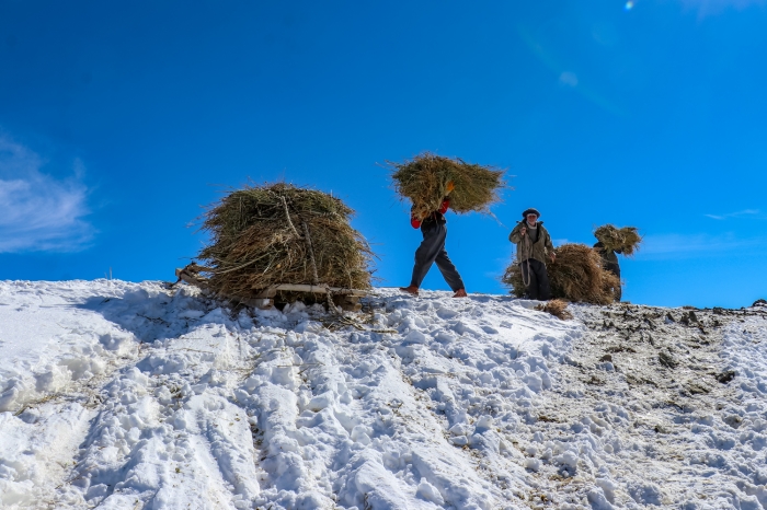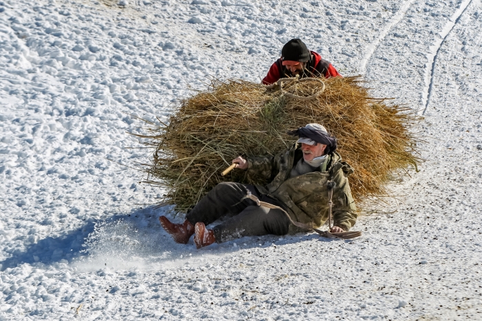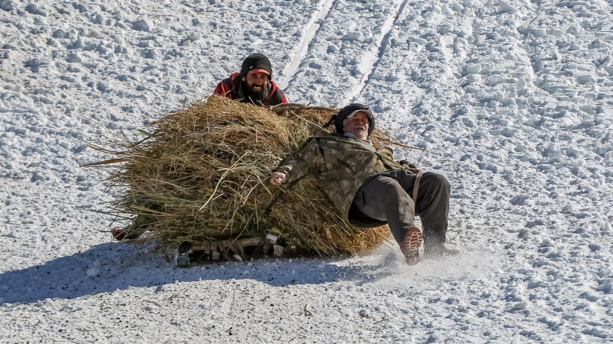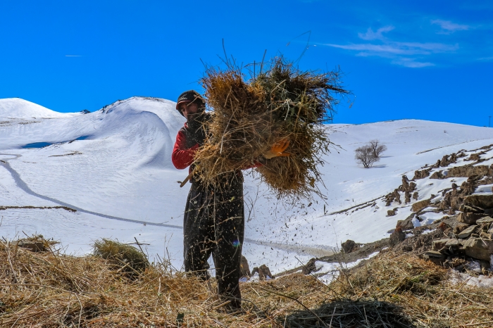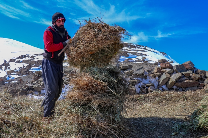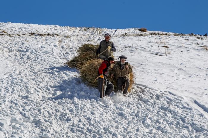 Hayvanlarının yiyecek ihtiyacını, yazın biriktirdikleri dağların zirvesinden kızaklarla getirdikleri otlarla karşıladıklarını anlatan Gülmez, "Kar yağdıktan sonra otları kızakla köye getiriyoruz. Otları kızaklarla indirmek daha kolay oluyor. Kızakları kendi imkanlarımızla yapıyoruz. Günde 3 defa dağa çıkıp ot getiriyoruz. Hava karlı olduğu zaman çok zorlanıyoruz. Çığ tehlikesinden dolayı bazen çıkamıyoruz."