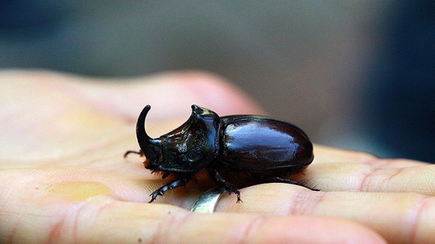 BİNGÖL'de bir çiftçi, dünyanın en güçlü ve nadir bulunan hayvan türlerinden olan gergedan böceği (oryctes nasicornis) buldu.