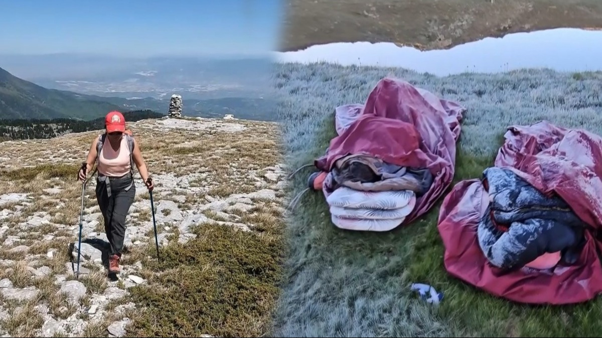 Geceden yola çıkan dağcılar, sabah uyandıklarında tulumlarının üzerine yağan kırağı görünce gözlerine inanamadı. Uludağ'ın 2 bin 543 rakımlı zirvesine çıkan dağcıların kaydettikleri göller, sisler, ayıların ayak izleri ve ilginç doğa olayları izleyenleri büyüledi.