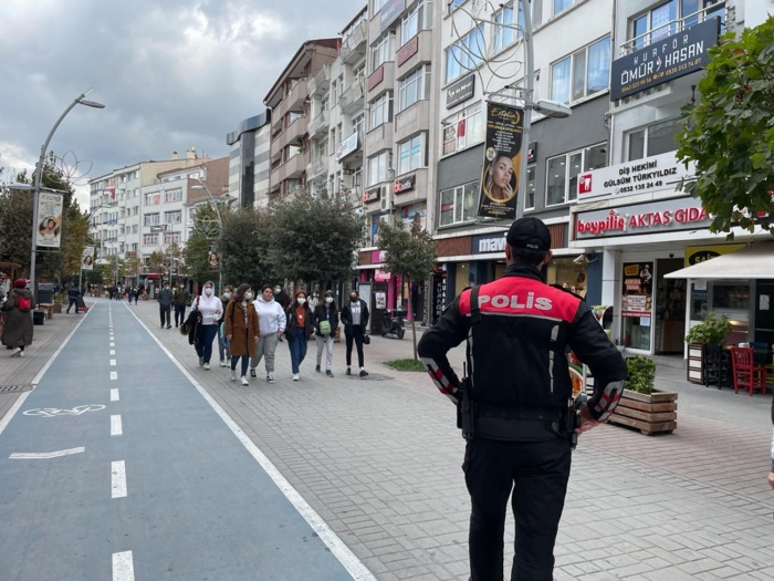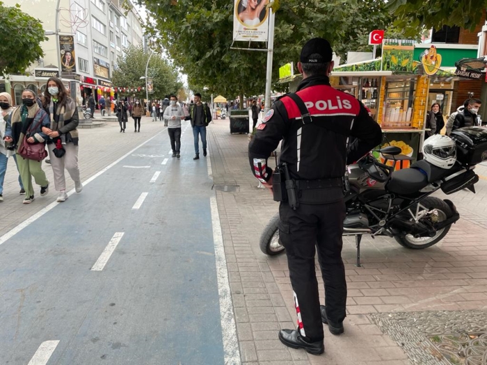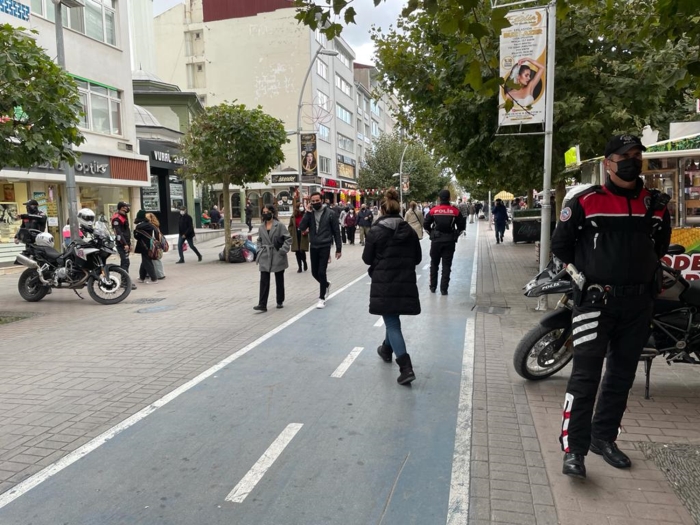Polis ekipleri, bu kapsamda kentin en işlek İzzet Baysal Caddesi'nde maske ve sosyal mesafe kontrolü yaptı.
