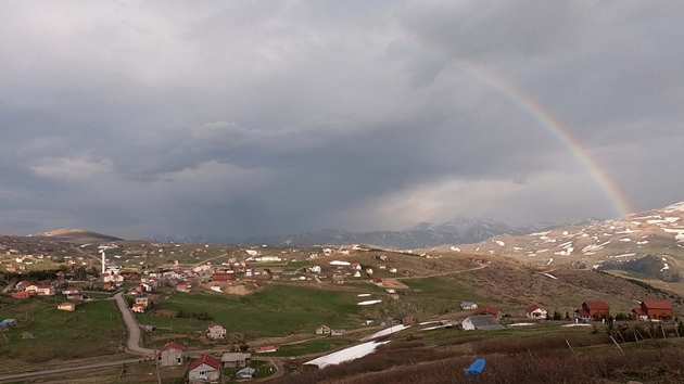 Ordu´da 2 bin rakımlı Çambaşı Yaylası'na giden vatandaşlar, kar kütlelerinin olduğu yerlerde naylon ve plastikler ile kayak yaptı. Yaylada yağan yağmurunun ardından ortaya çıkan gökkuşağı seyri doyumsuz görüntü oluşturdu. Ziyaretçiler, bu anları cep telefonlarıyla da görüntüleyip, kar ve manzaranın keyfini sürdü.