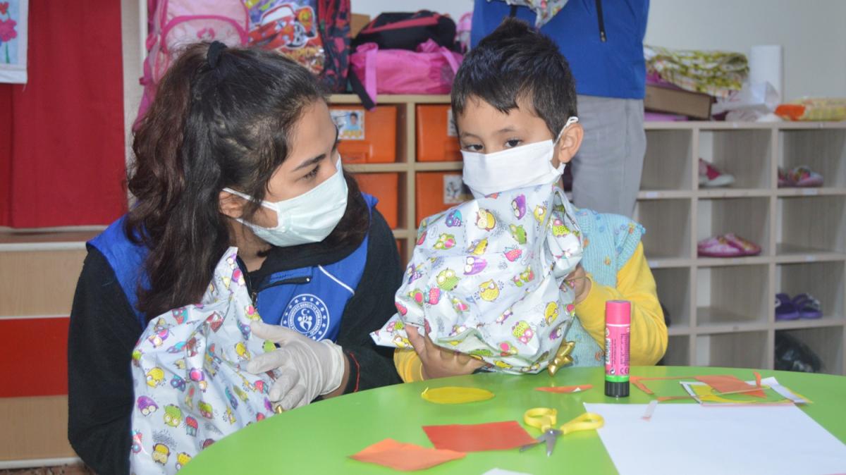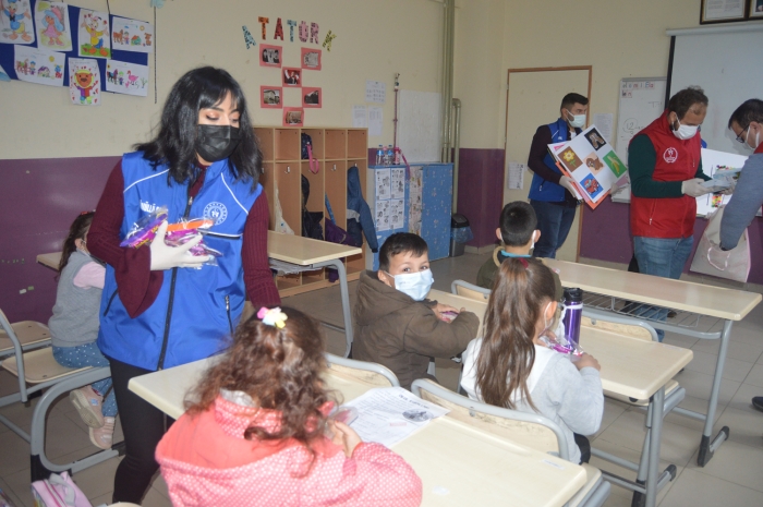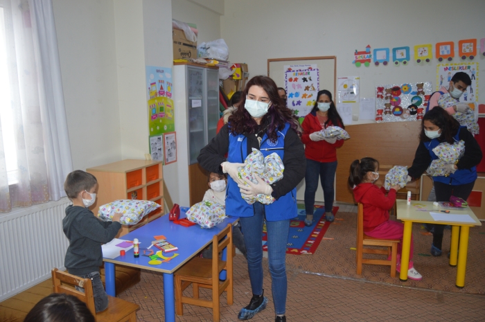 Hediyeler müdürlükte görevli gençler tarafından anaokulunda ve birinci sınıfta okuyan öğrencilere verildi.