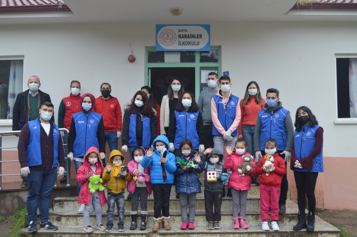 Bartın Gençlik Merkezi Müdürlüğünde görevli gençlik liderleri ve gönüllü gençler tarafından temin edilen oyuncak, kitap ve eğitim materyalleri, Karainler Köyü İlkokulu'nda eğitim gören öğrencilere hediye edildi.