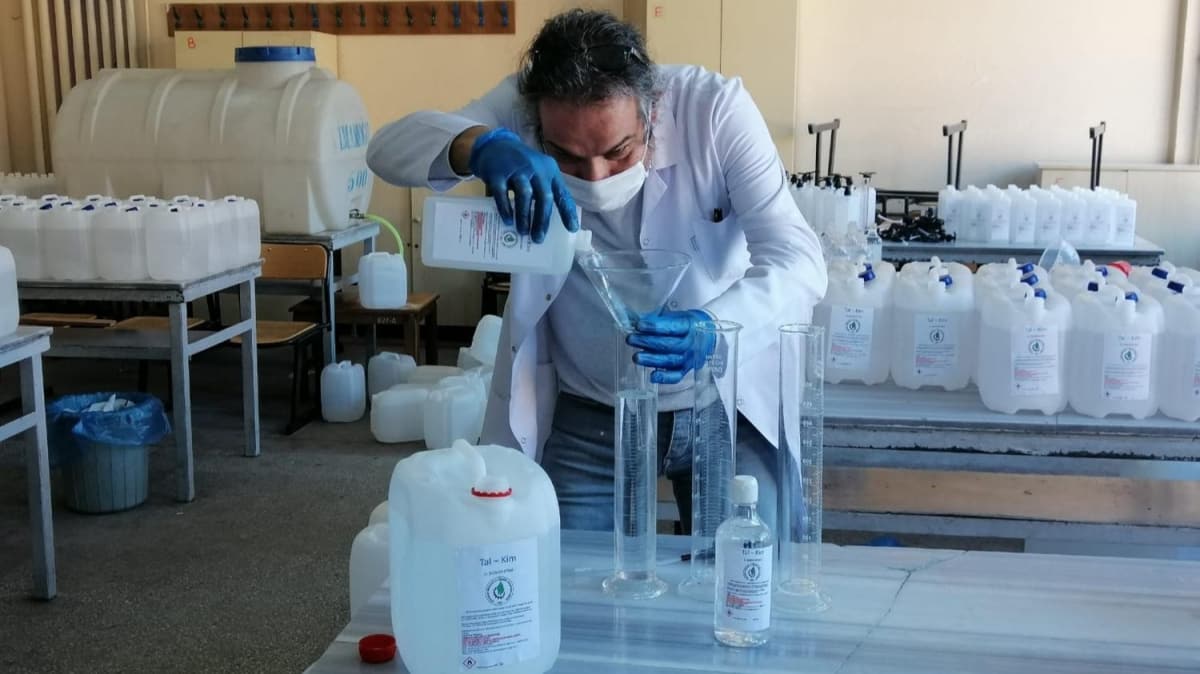 Kimya öğretmeni Kamer Kurtul, "Ürettiğimiz dezenfektanlar şu anda el dezenfektanı, yüzey dezenfektanı ve ortam dezenfektanı. Bunlar oksijenli su bazlı. El dezenfektanlarımız alkol bazlı. Dünya Sağlık Örgütü’nün tavsiye ettiği ölçüler doğrultusunda minimum yüzde 70 alkol ve elimizi tahriş etmemesi için kullandığımız gliserin var. Hiçbir şekilde elde tahribat ve herhangi bir cilt bozukluğuna sebebiyet vermez" dedi.