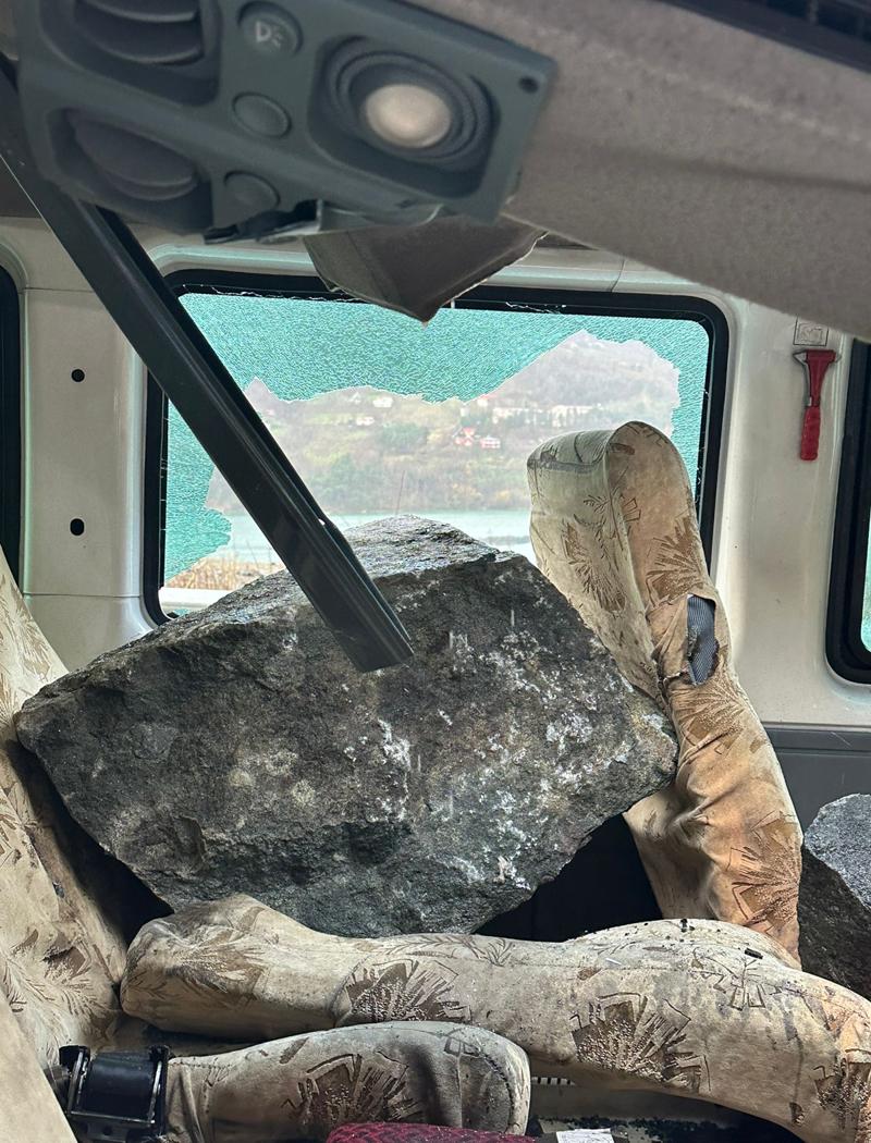 Kaya parçalarının minibüsün tavanını parçalayarak araç içerisine girdiği kazada, minibüste bulunan sürücü ve 2 kişi yaralanmadı.