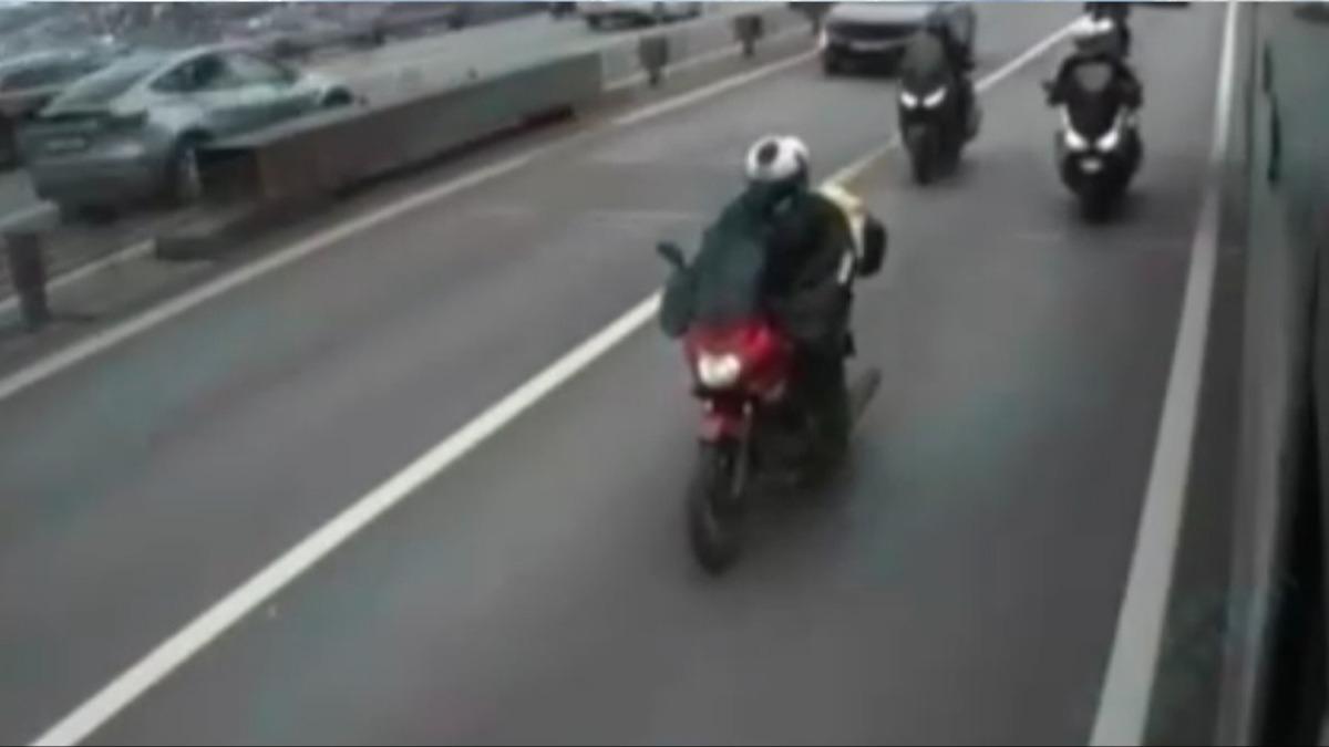 İstanbul'da etkili olan şiddetli rüzgar nedeniyle 15 Temmuz Şehitler Köprüsü'nde ilerlemekte güçlük çeken motosiklet sürücülerine metrobüslerin siper olduğu anlar güvenlik kamerasınca kaydedildi.