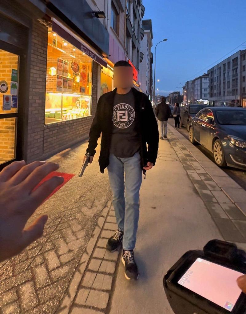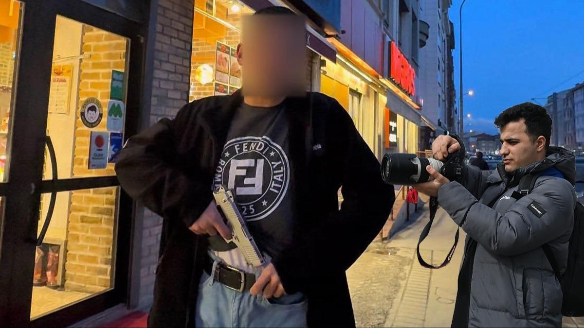 Süleyman Çakır'ın yeğeniyiz, bizde yanlış olmaz" dedi. Fotoğrafları inceleyen şahıs, "Oyuncak silah zaten, üstüme gelince şaka yapayım dedim. Kusura bakma özür dilerim" diyerek konuştu. O anlar fotoğrafçının yakasında takılı kameraya anbean yansıdı. Şahıs daha sonra poz vererek fotoğraf çekilmeye devam etti.
