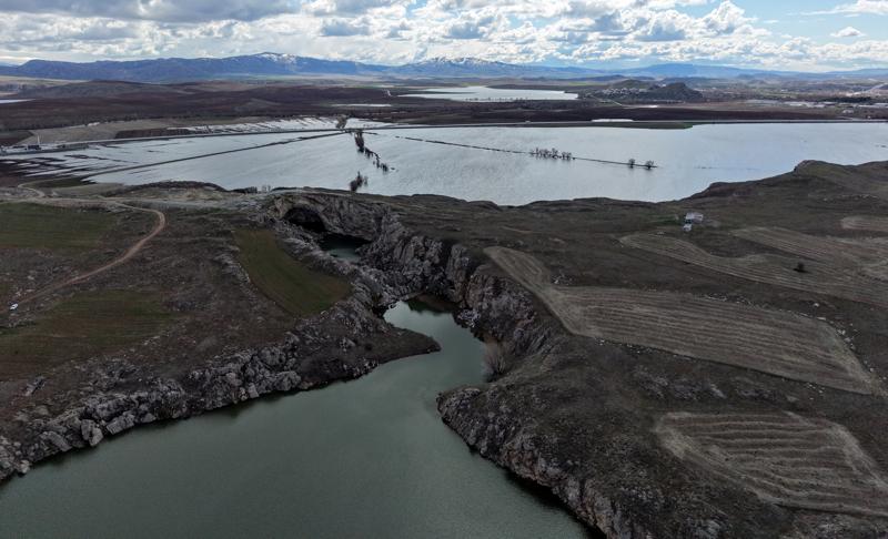 Göl ile bölgedeki Yarhisar, Dışkapı ve Durulmuş köyleri arazisinde yaklaşık 15 kilometrelik hatta oluşan su birikintileri, dronla görüntülendi.