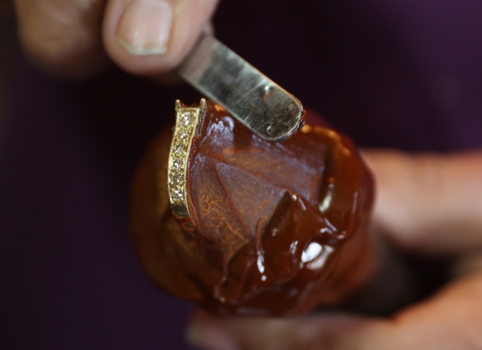 "Mıhlama sanatı yüzük, küpe, bilezik, broş gibi gelen bütün işlerin üzerine takılan taşların sanatıdır. Topkapı Sarayı'nda padişahın tahtına taşlar mıhladıklarını görüyoruz. O zamanlarda bile taş takma sanatı vardı. Size bir yüzük gösteriyorum. Bu yüzüğün kenarları delik ve bunların hepsine taş konacak. Şimdi şu yüzüğü bu vaziyette gördüğünüzde hiçbir şey anlamıyorsunuz. Ama iş bittikten, taşlar konulduktan sonra iş meydana çıkıyor ve o vakit 'ne güzel' diyorsunuz."