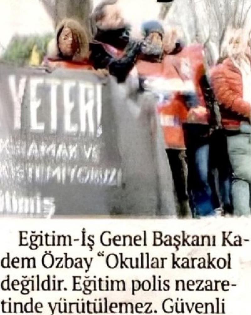 Her daim hükümet karşıtı cephe ile omuz omuza yürüyen Eğitim-İş Sendikası Genel Başkanı Kadem Özbay, "Okullara güvenlik kadrosu" açılması talebini paylaştı. Ancak daha geçen ay "okulda güvenlik istemiyoruz, polis istemiyoruz" diye eylemdeydiler.