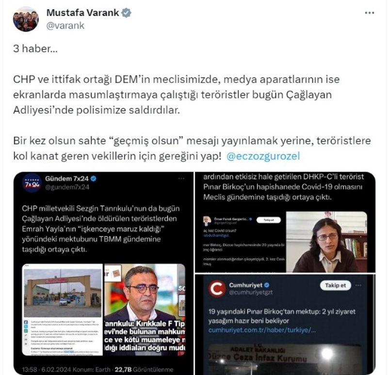 Fatih Camii'ndeki bıçaklı saldırı, Terör Örgütü DEAŞ'ın Santa Maria Kilisesi'ne saldırısı şimdi de Terör Örgütü DHKP/C militanlarının Çağlayan Adliyesi'ndeki katliam girişimi. Kahraman polisimiz iki teröristi oracıkta etkisiz hale getirdi. Adalet Bakanı Tunç, "İlk kapıdan giremeyince bu kapıya yönelmişler içeri girebilselerdi belki de çok daha büyük bir eylem yapacaklardı" diye durumu anlattı. Hep söylediğimiz gibi bölgesinde güçlenen Türkiye'nin yürüdüğü yolda tökezlemesi için karanlık eller iş başında. Ama eski Türkiye yok. Kahramanlar ya asfalta yapıştırıyor o teröristleri ya sarı torbaya koyuyor. Kaçmaya çalışanlar kıskıvrak yakalanıyor. O yüzden Türkiye üstüne senaryo yazanlara hatırlatmak lazım çevirdiğiniz filmlerin milleti etkilemesinin de Türkiye'yi yolundan döndürmesinin de imkânı yok. Bu arada AK Parti Milletvekili Mustafa Varank saldırıyla ilgili kitabın ortasından konuşmuş. Milletin sesi olmuş.