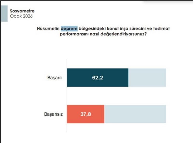 Ve işin acısı bu yalanlar önemli bir kitlede zihinleri bulandırmaya da yetiyor. Areda Survey'in ocak ayı araştırmasında konuyla ilgili çok çarpıcı bir sonuç var... Araştırmaya katılanların yüzde 37,8'i hükümetin deprem konutları konusunda başarısız olduğuna inanıyor.