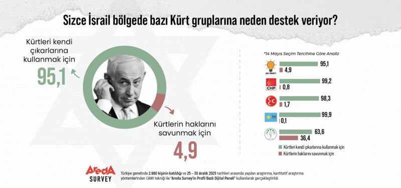 Medyada bana göre gerektiği kadar yer bulmadı bu yüzden gölgede kalmasına da gönlüm razı olmadı. Zira sonuçları gördüğümde ülkem, yaşadığımız coğrafya adına gerçekten çok sevindim... Areda Survey'in yaptığı anketin sonucu umut verici... Zira Türk Halkına Göre İsrail, Bölgedeki Kürt Gruplarını Kendi Çıkarları İçin Destekliyor... Araştırmaya göre, Türk halkının yüzde 95,1'i İsrail'in bazı Kürt gruplarını kendi çıkarları için desteklediğini düşünüyor. Yüzde 4,9'u ise İsrail'in desteğini Kürtlerin haklarını savunmaya yönelik olduğu kanaatini taşıyor. Daha çarpıcı olansa DEM Parti seçmenlerinin yüzde 63,6'sı da "İsrail'in Kürtleri kendi çıkarları için kullandığını düşünüyor. Özetle dilimiz döndüğünce sık sık anlatmaya çalıştığımız "Büyük İsrail Projesi", YPG'nin İsrail'in eşik bekçisi yapılmak istenmesi, David Koridoru Planı gibi meseleler milletin de yakın takibinde...
