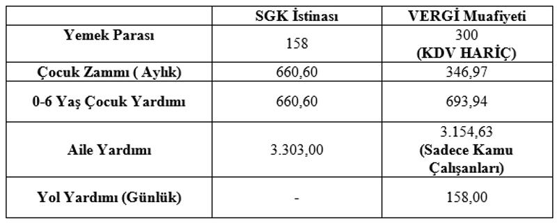 Vergi ve sosyal güvenlik mevzuatında yer alan bu tür istisna ve muafiyetlerde mümkün olduğunca ortak bir sistem oluşturulmalı, Maliye ile SGK arasında uyumlu bir yapı kurulmalı, aynı kalemler için aynı tutarlar ve aynı sınırlar uygulanmalıdır.